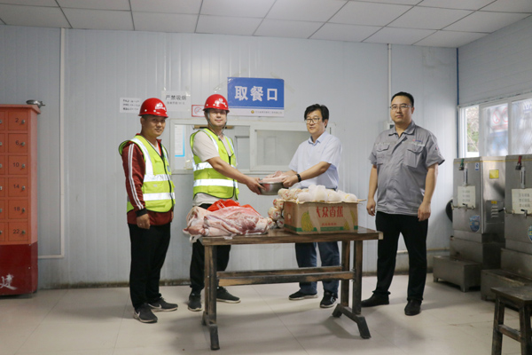 之后,劉志剛帶著月餅、豬肉等慰問品到作業(yè)班組生活區(qū)對(duì)一線工人進(jìn)行慰問,在食堂劉志剛把豬肉遞到班組長手里并囑咐他們一定要提高節(jié)日期間的伙食水平,讓堅(jiān)持在現(xiàn)場施工的工人吃好,消除他們的后顧之憂。