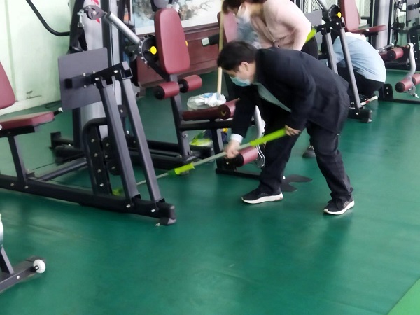 參與活動的20余名同志,分工合作,雖然大家來自不同部門、不同崗位,但爭先恐后、合作默契,清理地面、擦拭健身器材、清潔桌凳?!扒懊娴哪型緜兗佑土耍覀兛熠s上你們了!”負責拖地的九分公司主任經(jīng)濟師劉彩在后面說道。“這個乒乓球擋布拿抹布擦拭的效果不太好,用外面的高壓水槍沖洗試試吧!”九分公司主任會計師付世芳一邊用抹布擦拭擋布一邊提出自己的合理化建議,“這個辦法好!”九分公司綜合辦公室主任張路平同意道。