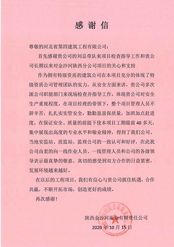 業(yè)主單位陜西金沙河面業(yè)有限責(zé)任公司在感謝信中,對公司管理團隊的專業(yè)水平和綜合實力給予了充分肯定,表達(dá)了今后與公司深化合作的意愿。來自不同單位的錦旗上,分別寫著“服務(wù)至上 誠信履約”“創(chuàng)精品工程 展鐵軍風(fēng)采”“技術(shù)創(chuàng)新 高質(zhì)高量”,充分體現(xiàn)了對公司管理團隊誠信守責(zé)、真抓實干、技術(shù)過硬、能打勝仗工作作風(fēng)的一致肯定。