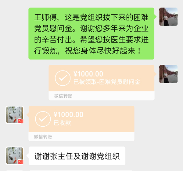 “現(xiàn)在身體怎么樣?生活可有什么困難?”因受疫情影響,不能對所有困難黨員和困難職工實現(xiàn)入戶走訪,公司黨委和工會就通過電話一一聯(lián)系,仔細詢問他們疫情防控期間生活情況、身體健康狀況,根據(jù)他們的實際情況,將慰問金通過微信轉(zhuǎn)賬發(fā)給個人,米面油等慰問品能送到小區(qū)門口的送到小區(qū)門口,能送到工地的送到工地。