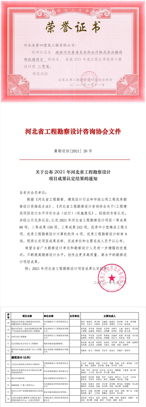 7月5日,公司設(shè)計院收到榮譽(yù)證書和文件,《政協(xié)河北省委員會辦公廳機(jī)關(guān)辦公樓局部改造項(xiàng)目》獲2021年石家莊市優(yōu)秀工程設(shè)計獎二等獎、河北省工程勘察設(shè)計項(xiàng)目成果獎三等獎。