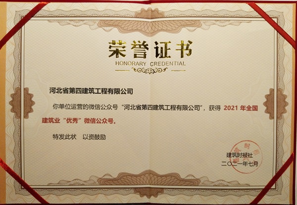 7月16日,在“2021建筑業(yè)微信公眾號(hào)運(yùn)維經(jīng)驗(yàn)交流研討會(huì)暨全國建筑業(yè)優(yōu)秀公眾號(hào)頒獎(jiǎng)典禮”上,公司微信公眾號(hào)“河北省第四建筑工程有限公司”被評(píng)為“2021年全國建筑業(yè)優(yōu)秀微信公眾號(hào)”。
