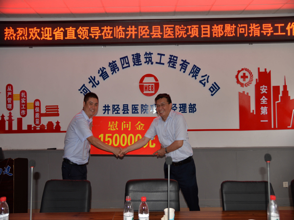 7月26日下午,河北省直工委副書記范金龍一行到二分公司井陘縣醫(yī)院項目部,對奮戰(zhàn)在一線的職工進行暑期慰問,為他們送來了慰問金和慰問品。集團工會主席王文利、公司黨委副書記、紀委書記、工會主席李懷生、二分公司黨總支書記孫立鋒一同參加。