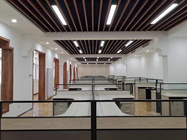 在該項(xiàng)目的裝飾設(shè)計(jì)中,設(shè)計(jì)院充分利用原建筑條件,在盡可能節(jié)約裝修成本的基礎(chǔ)上,將辦公環(huán)境打造成為簡約優(yōu)雅、別具一格的空間。改造區(qū)域原為多個(gè)小型辦公室,并且處于院落的南面,采光極差。設(shè)計(jì)師經(jīng)過與領(lǐng)導(dǎo)協(xié)商,除保留個(gè)別房間外,將剩余的幾個(gè)辦公室隔墻拆除,從而獲得了一個(gè)大而開敞的辦公區(qū),可容納36個(gè)寬敞工位,并取消此辦公區(qū)域所有的門,且將原窗戶臺(tái)面降低至距地40厘米高,最大可能的利用了自然采光。色調(diào)的選擇上,墻面大面積采用白色乳膠漆與硅藻泥,一定程度上也彌補(bǔ)了自然采光的不足。