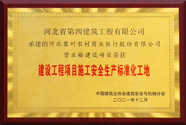 2021年12月22日,公司收到中國建筑業(yè)協(xié)會安全與機(jī)械分會下發(fā)的文件,我公司施工的河北冀州農(nóng)村商業(yè)銀行股份有限公司營業(yè)樓建設(shè)項目喜獲全國安全生產(chǎn)標(biāo)準(zhǔn)化工地,這是公司第9次獲得此項榮譽(yù)。