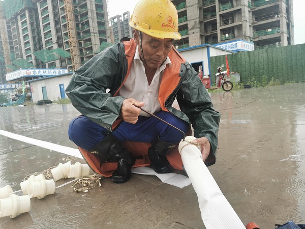 針對因強降雨導(dǎo)致項目部分地區(qū)已出現(xiàn)的積水,項目部立即組織人員在不同房號、洞口分別用10余臺潛水泵進行抽水,做到“隨下隨排”,避免因積水問題影響項目進度。