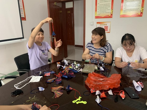 在傳統(tǒng)習俗中,玲瓏可愛的各色香包也是端午節(jié)必不可少的元素。包完粽子后大家轉移陣地到了活動室,大家圍坐桌邊,面前堆放著一份份材料包,有棉布、艾草、針線、中國結流蘇。面對這個從來沒有做過的DIY,大家開始研究起來,有的用手機搜索縫制方法流程,有的直接比來比去親自摸索著縫起來。有職工說:“這有點像咱們小時候老人們縫的毽子,那個里面裝的是五谷雜糧,咱們現(xiàn)在裝的是艾草?!薄斑@香囊可以掛在辦公室或者車上,有清香、驅蚊的功效?!薄拔宜闶侵懒?,這個流蘇應該縫在這個邊的中間,而不是角上……”大家你一句我一句,手中的針線穿梭在棉布間,用密密的針腳縫制出傳統(tǒng)佳節(jié)最好的注解,用絲絲線線纏繞出端午安康的美滿寓意,一個個精巧可愛的三角香囊在大家的努力下完美呈現(xiàn)。
