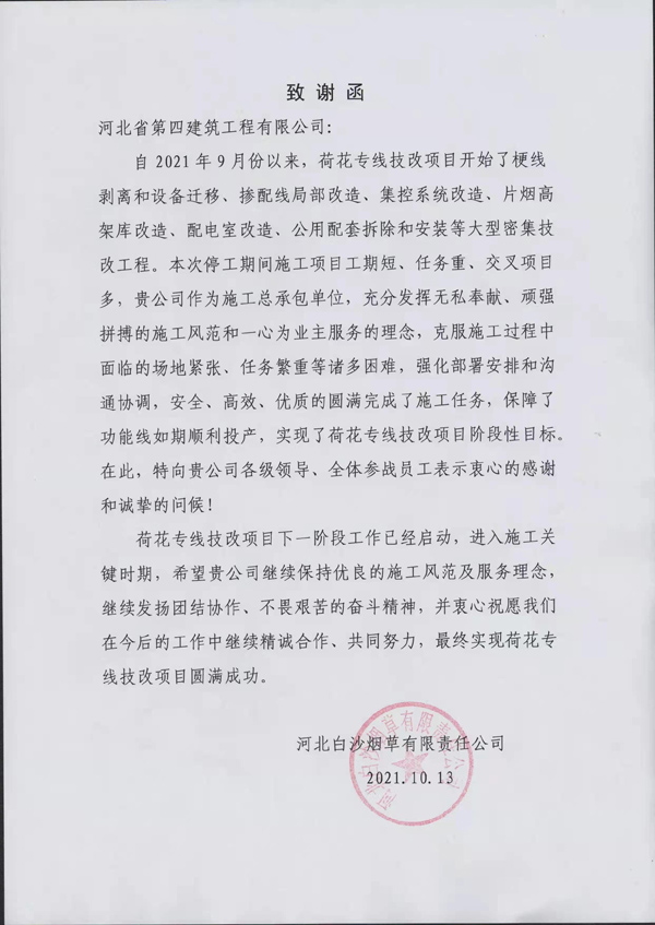 一紙致謝函,字字鼓人心!10月13日,三分公司中煙項(xiàng)目部收到業(yè)主河北白沙煙草有限責(zé)任公司發(fā)來的致謝函,感謝項(xiàng)目部克服場(chǎng)地緊張、任務(wù)重等諸多困難,圓滿完成施工任務(wù),實(shí)現(xiàn)了荷花專線技改項(xiàng)目階段性目標(biāo)。