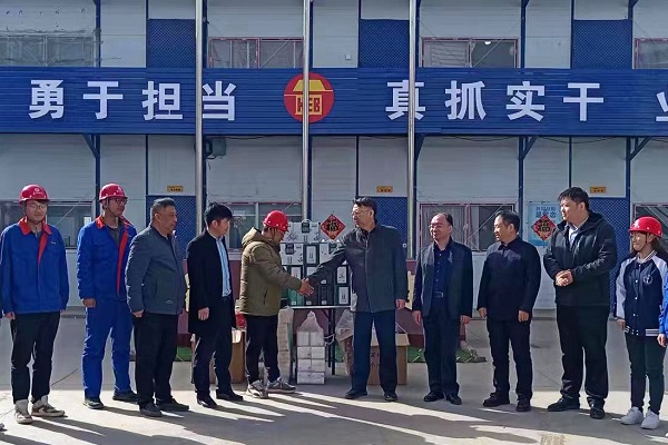 在會議室,唐志強聽取了項目基本情況匯報,詳細了解職工生產(chǎn)生活、勞動防護等方面情況。隨后深入施工現(xiàn)場,查看職工工作環(huán)境并與職工交流,傾聽一線職工聲音。C型料場正在進行擋墻主體施工,他叮囑現(xiàn)場管理人員高度注意安全,防止高空墜落。來到項目辦公區(qū),院內(nèi)墻壁上“誠信守責、勇于擔當、真抓實干、業(yè)績服人”的工作總要求顯得格外醒目,“大家遠離家鄉(xiāng),在一線兢兢業(yè)業(yè),工作辛苦了,我代表公司工會來看望你們……”他向每位職工送上保溫杯、牛奶等慰問品,“內(nèi)蒙古風沙大,最近天氣冷,大家一定要注意保暖……”他和職工一一握手問好,并送上殷切關懷。