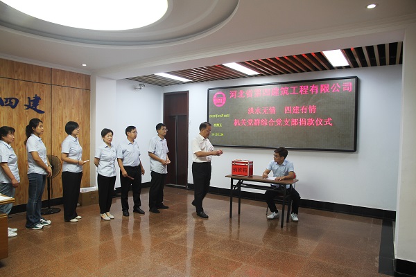 洪水無情,四建有愛。公司發(fā)揚“一方有難,八方支援”的中華民族優(yōu)良傳統(tǒng),9月7日—14日,僅一周時間,全體職工匯聚愛心捐助款項共計111723元,通過集團公司賬戶捐獻(xiàn)給易縣人民,用于易縣抗洪救災(zāi)和災(zāi)區(qū)人民重建家園。