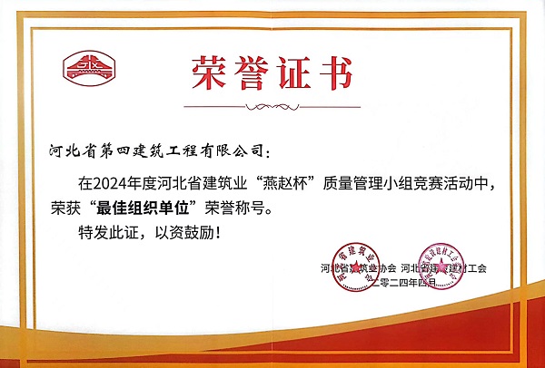 4月18日至20日,在河北省建筑業(yè)協(xié)會(huì)舉辦的2024年度河北省建筑業(yè)“燕趙杯”質(zhì)量管理小組競賽活動(dòng)中,公司參賽的16項(xiàng)成果全部獲獎(jiǎng),公司獲“最佳組織單位”榮譽(yù)稱號(hào)。